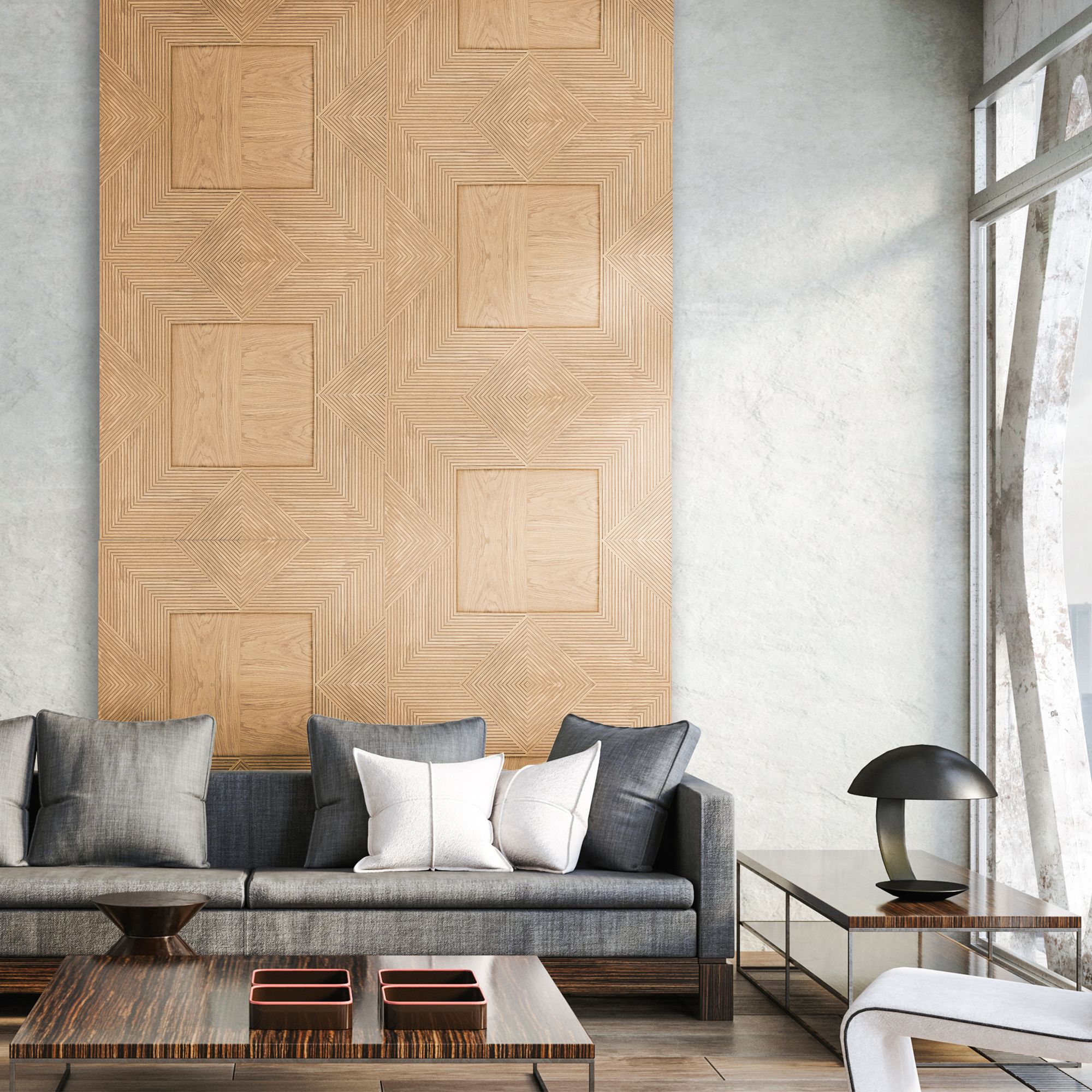 Стеновые панели в натуральном шпоне дуба с фрезеровкой и набором деталей разной направленности текстуры дерева. На основу, каждый элемент панели собирается в ручную. Покрытие Эко-лаком «Sirca» производство Италия.